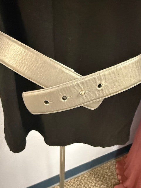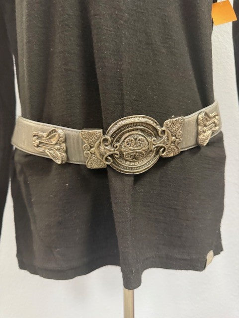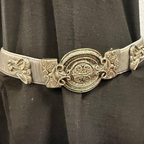 From the Doncaster collection, this gray leather belt has a back closure and features silver tone hardware including a center medallion. Measures 36"L x 2.5"W.
