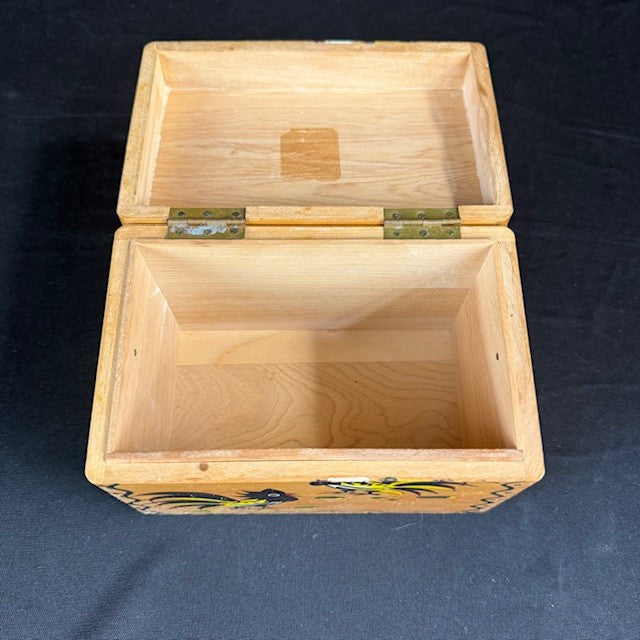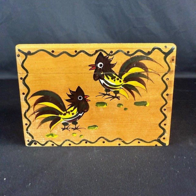 This vintage recipe box from Woodpecker Woodware features hand-painted roosters on a natural wood maple tone. The rectangular box has one compartment . Measures: 6"L x 3.75"W x 4"H. In very good condition.
